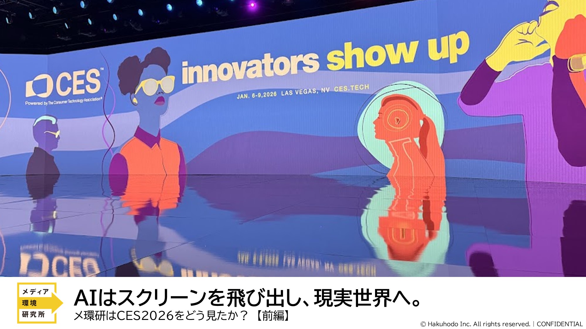 2026年1月6日から9日にかけて、米国ラスベガスで世界最大級のイノベーション展示会「CES 2026」が開催されました。 1967年の初回開催以来、家電見本市として歴史を刻んできたCESは、今やその枠を完全に踏み出し、あらゆる産業の「イノベーション」を網羅する場へと変貌を遂げています。各国の大企業からスタートアップまで、自社の商品やサービスを通して未来の生活を提案する場として注目されています。博報堂メディア環境研究所では継続的にこの地を取材し、テクノロジーが生活者の意識や行動をどう変えていくのかを定点観測してきました。 今回の前編では、研究デザインセンター研究主幹の島野真とメディア環境研究所所長の山本泰士が、現地で肌で感じた概要をお伝えします。