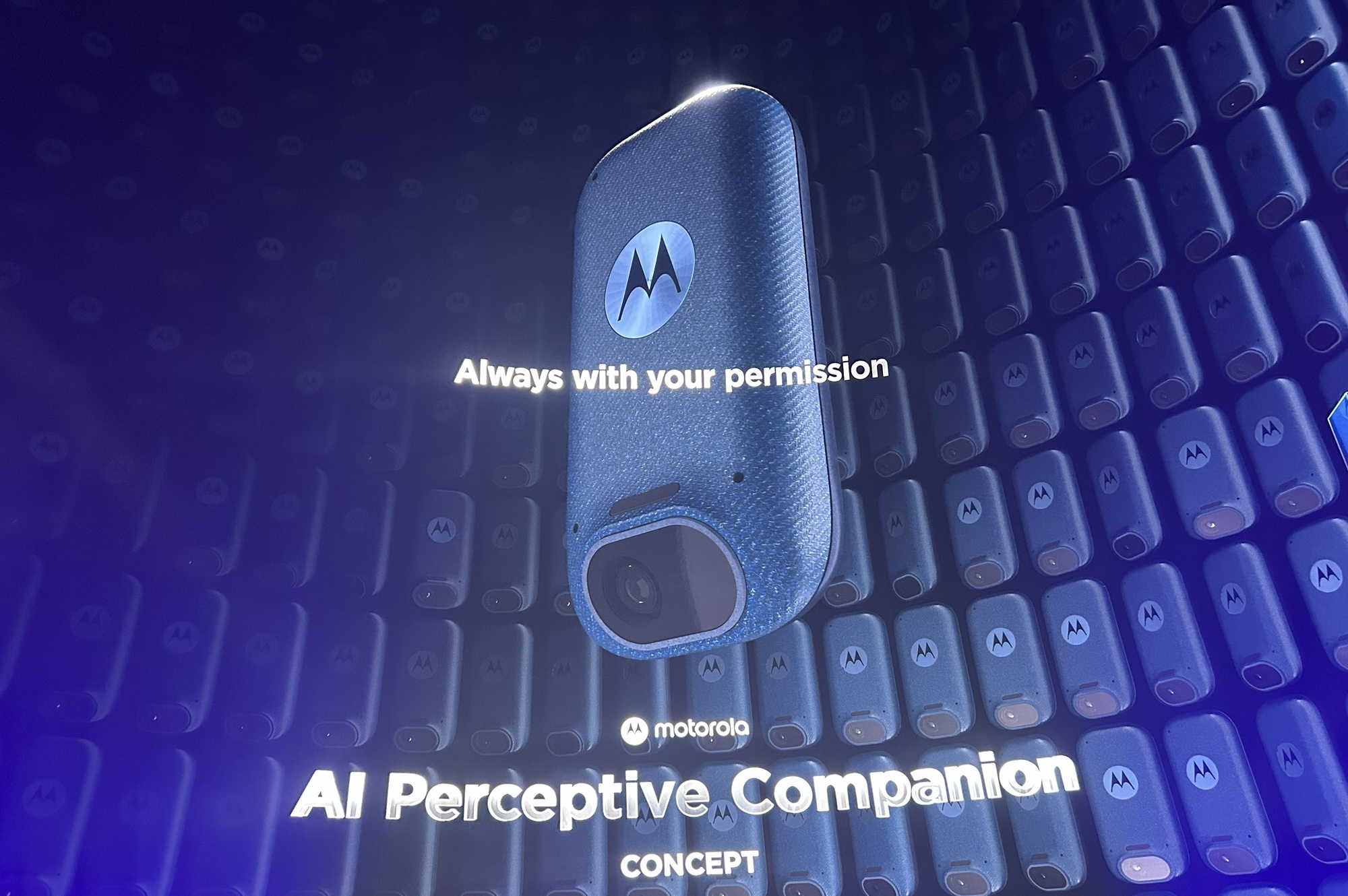 さらにLenovoのキーノートで会場を驚かせたのが、傘下モトローラ社のコンセプトデバイス「Project Maxwell」だ。ネックレスやピンのように身につけるウェアラブルな「AIコンパニオン」の試作機(PoC)で、超小型カメラとマイクがユーザーの視覚・聴覚を共有することが想定されている。ステージでは、状況を理解したAIがスマホ操作を挟まず「今日あったことをSNSにアップする文章にしましょうか?」と語りかけるなど、先回りして提案する様子が披露された。