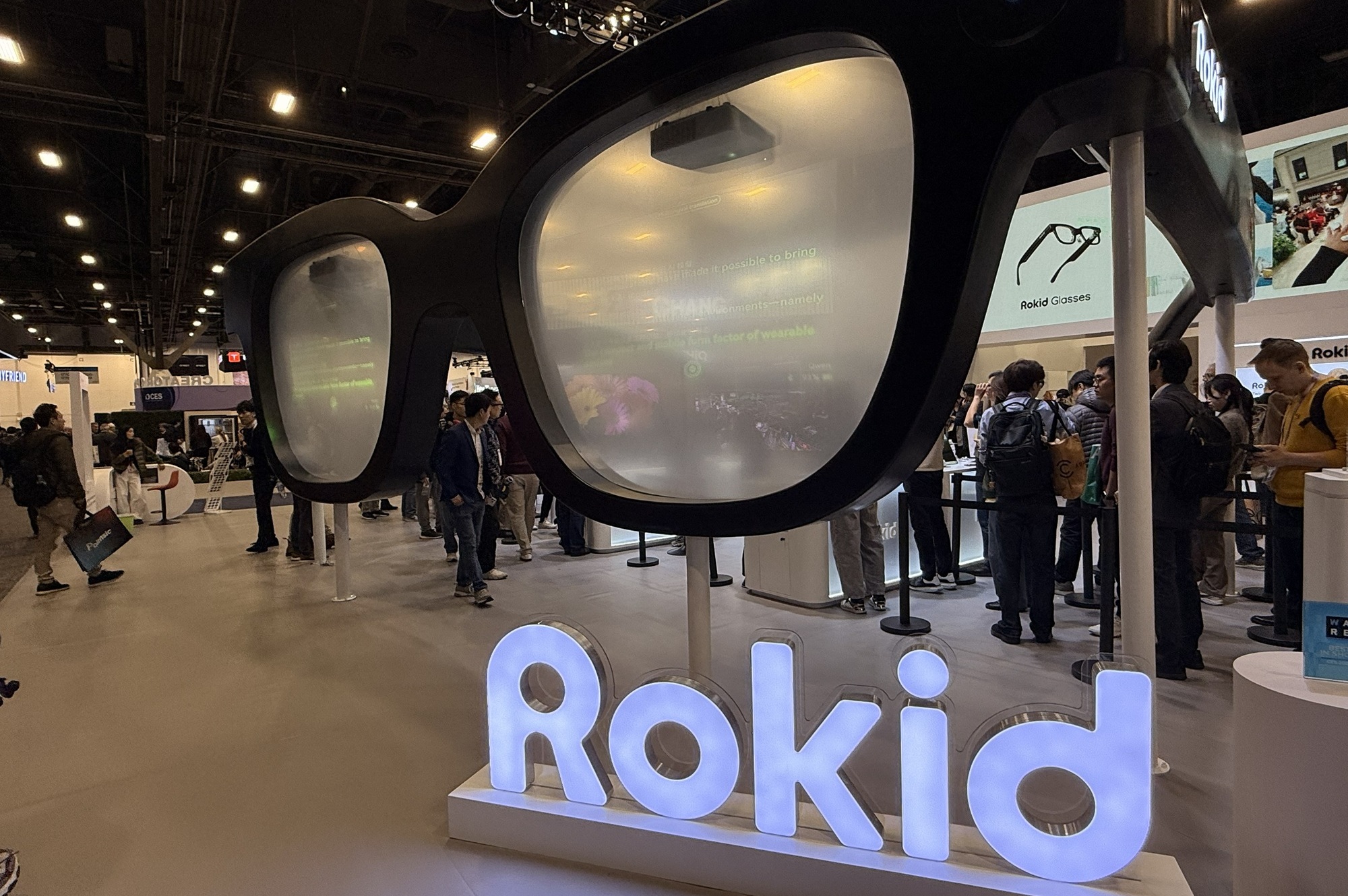 その中で人だかりを作っていたのが、ARグラスのパイオニアであるRokid(ロキッド)だ。筆者は25年秋に発売された「Rokid Glasses」を体験したが、まず驚いたのは軽さである。重量は49g。装着感は一般的な度付きメガネに近い。