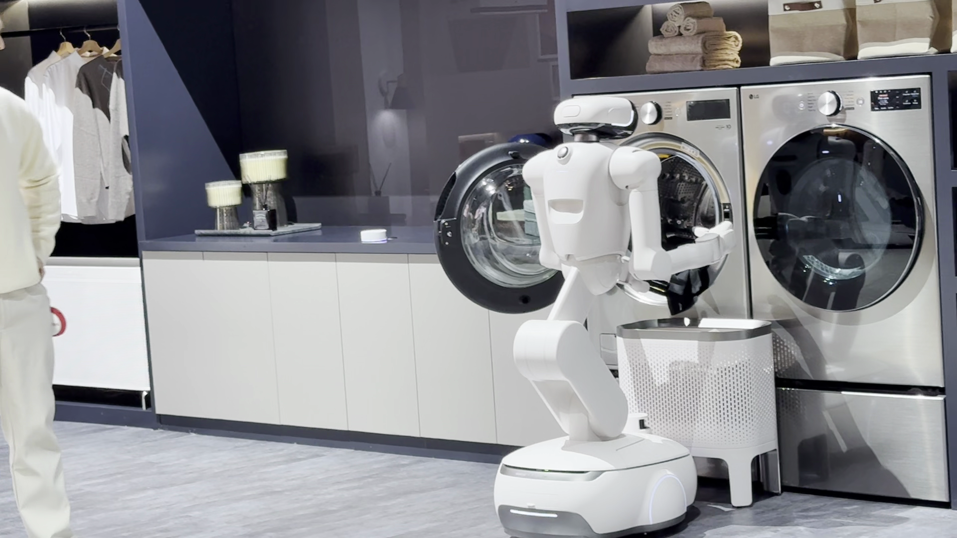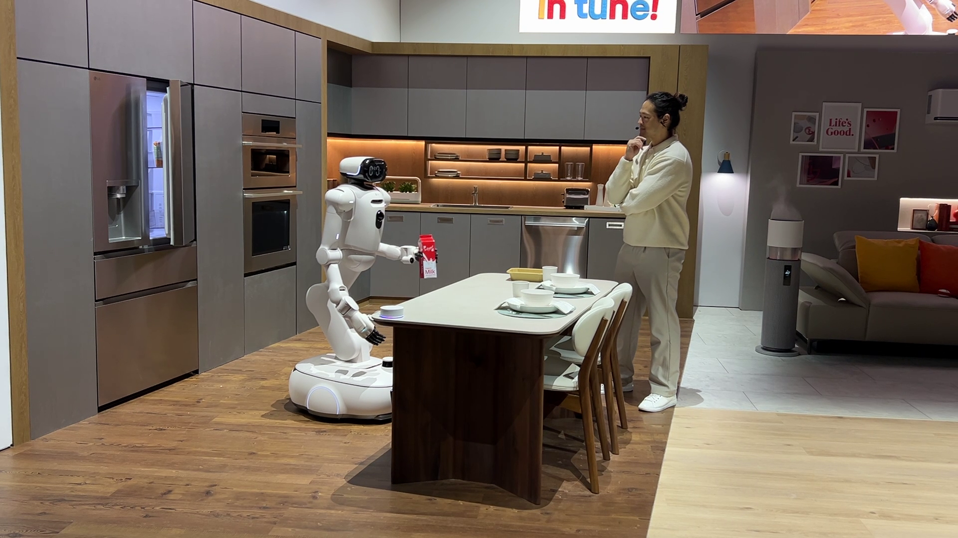 さらにLGブースで披露されたデモは、ヒューマノイドが家電・空間・人をつなぎ、生活の段取りそのものを代行する未来を示すものだった。車輪走行で滑らかに移動し、上半身に多関節アームと指を備えたCLOiDは、ただ「動く」だけではない。「家電製品と空間、そしてあなたをシームレスにつなぎ、真に有意義な一日を創り出す仲間(コンパニオン)」として設計されている、という説明が印象に残る。